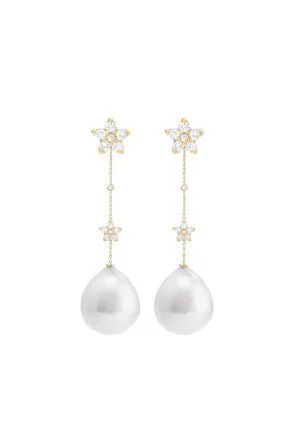 Shooting stars oorhangers (koppel) met south sea parels en 14 diamanten. Worden gedragen in combinatie met de studs.