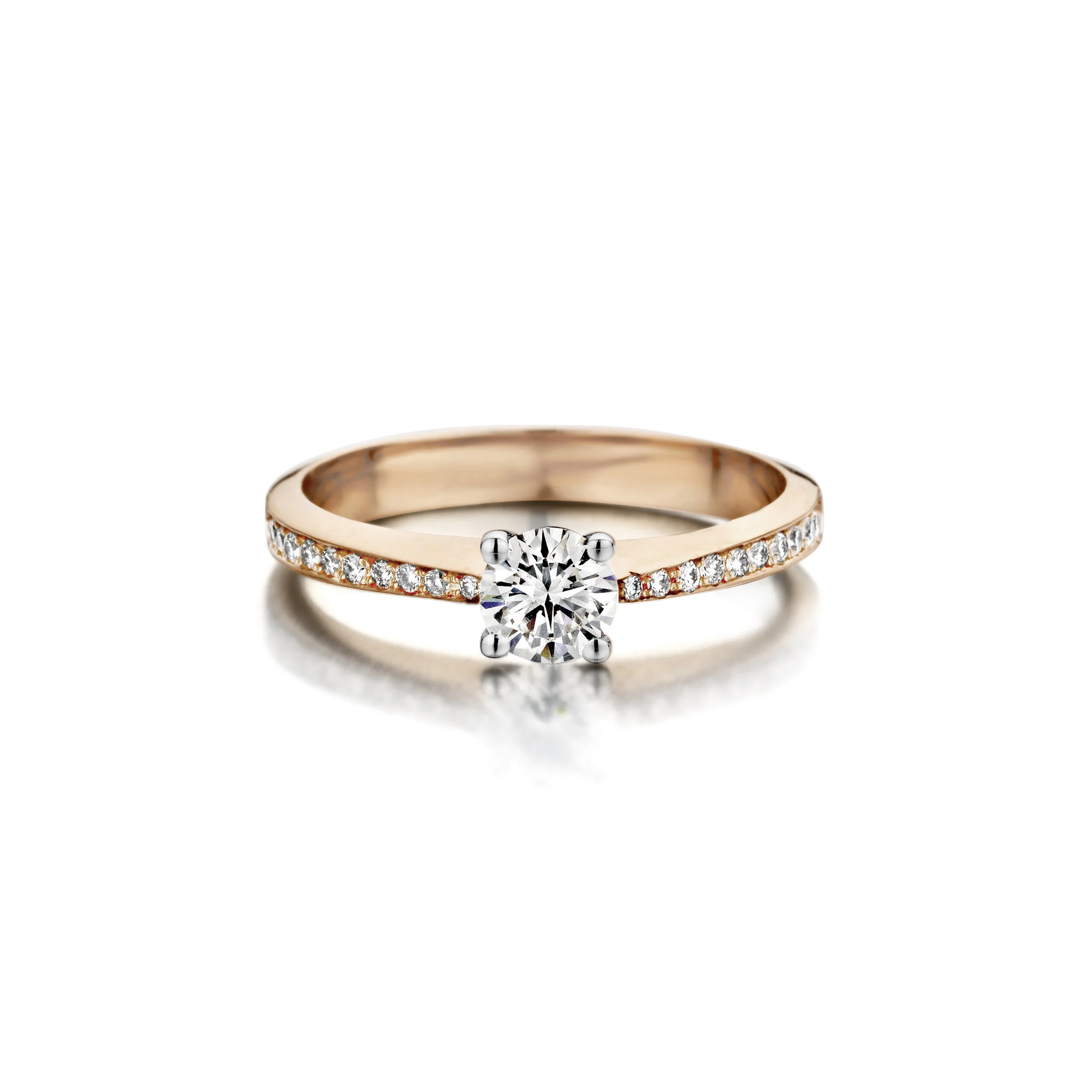 Een elegante ring die prachtig oogt met zijn 0,10ct briljanten langs beide zijden gezet. De Roos is vrouwelijk maar nooit overladen. Deze ring kan vervaardigd worden door het Martens atelier in Rosegoud, geelgoud, witgoud of platina.